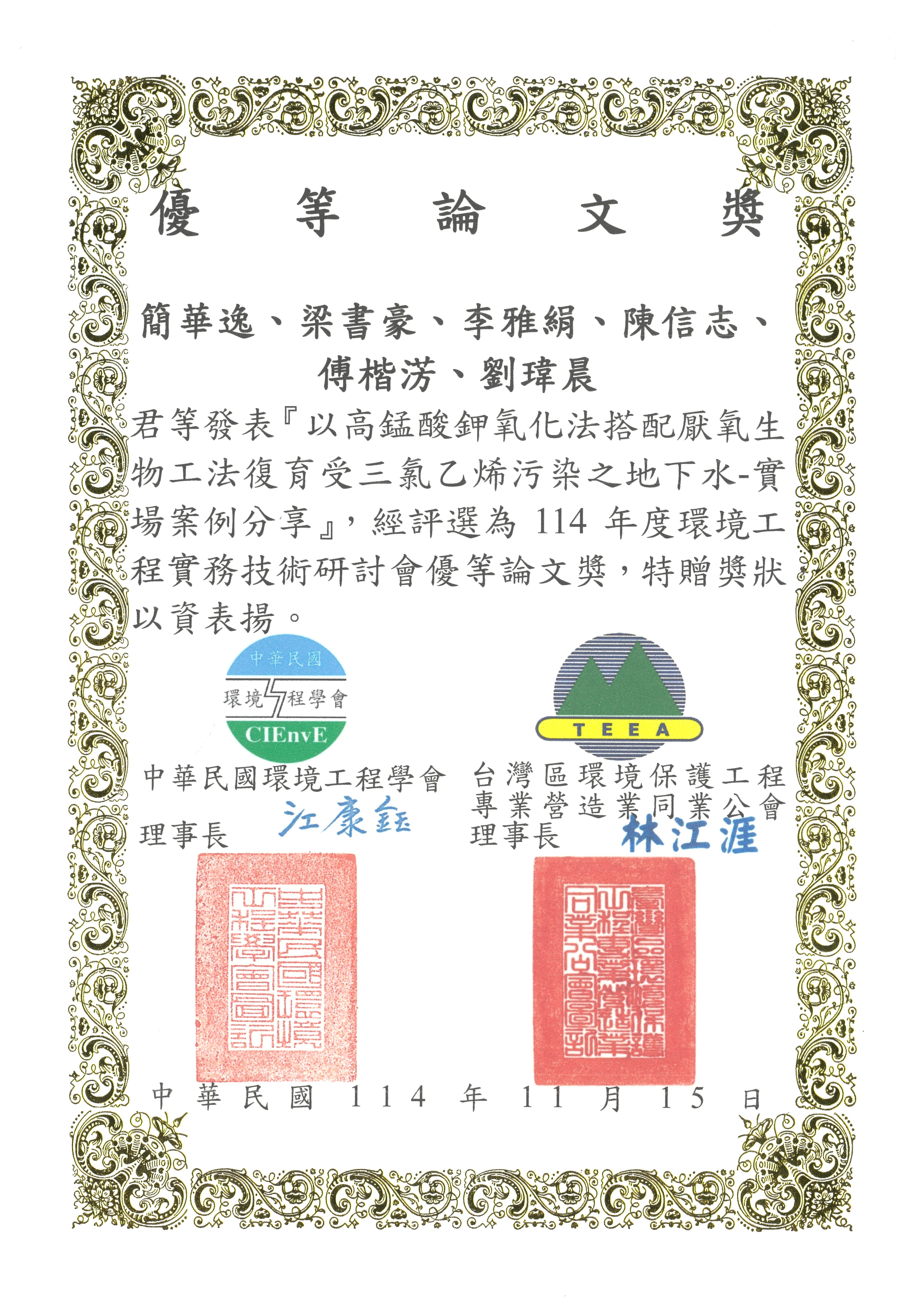 台氯子公司 – 寰靖公司發表「以高錳酸鉀氧化法搭配厭氧生物工法復育受三氯乙烯污染之地下水-實場案例分享」,獲評選為114年度環境工程實務技術研討會優等論文獎。