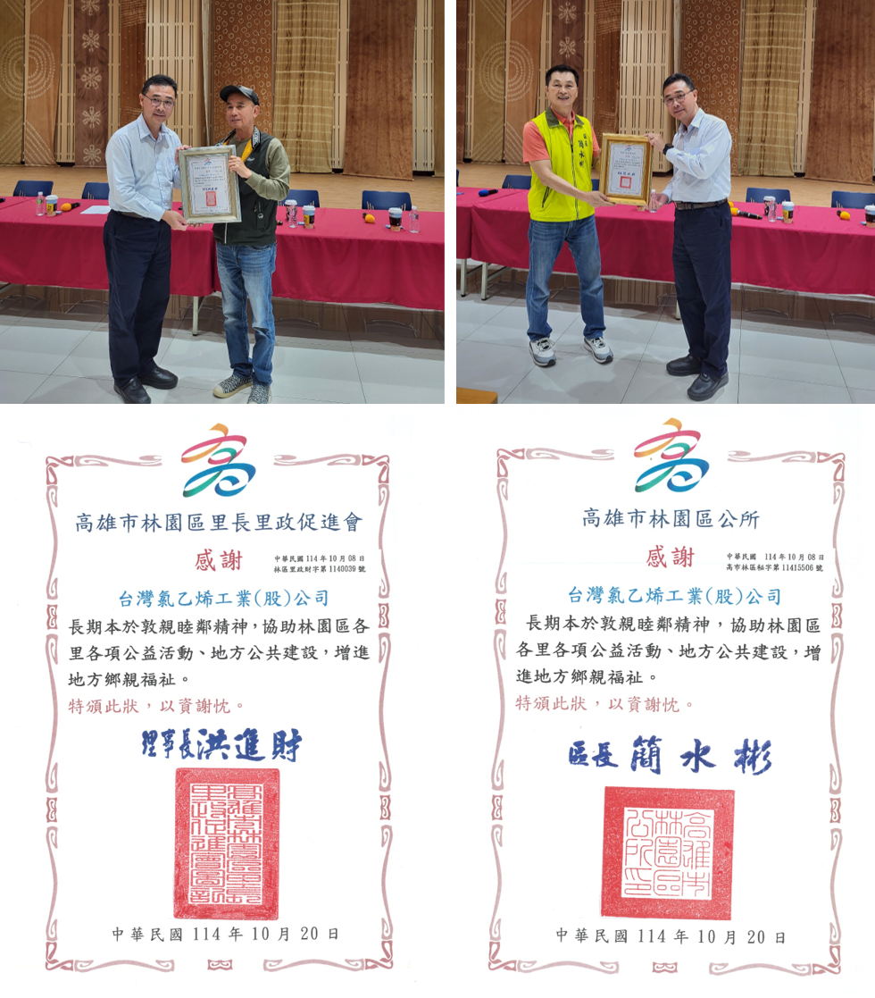 台湾永续能源研究基金会(TAISE)于 2025 年 9 月 11 日举办「2025 亚太暨台湾永续行动奖」,本届共计 503 件方案参赛,较去年成长 12.2%,最终评选出 399 件优良案例。台氯由母公司华夏海湾代表参赛,以 SDG 9《台氯生产单元导入智慧制造》 专案荣获银奖,并于台北世贸一馆举行的颁奖典礼中,由华夏 胡吉宏总经理代表受奖。
