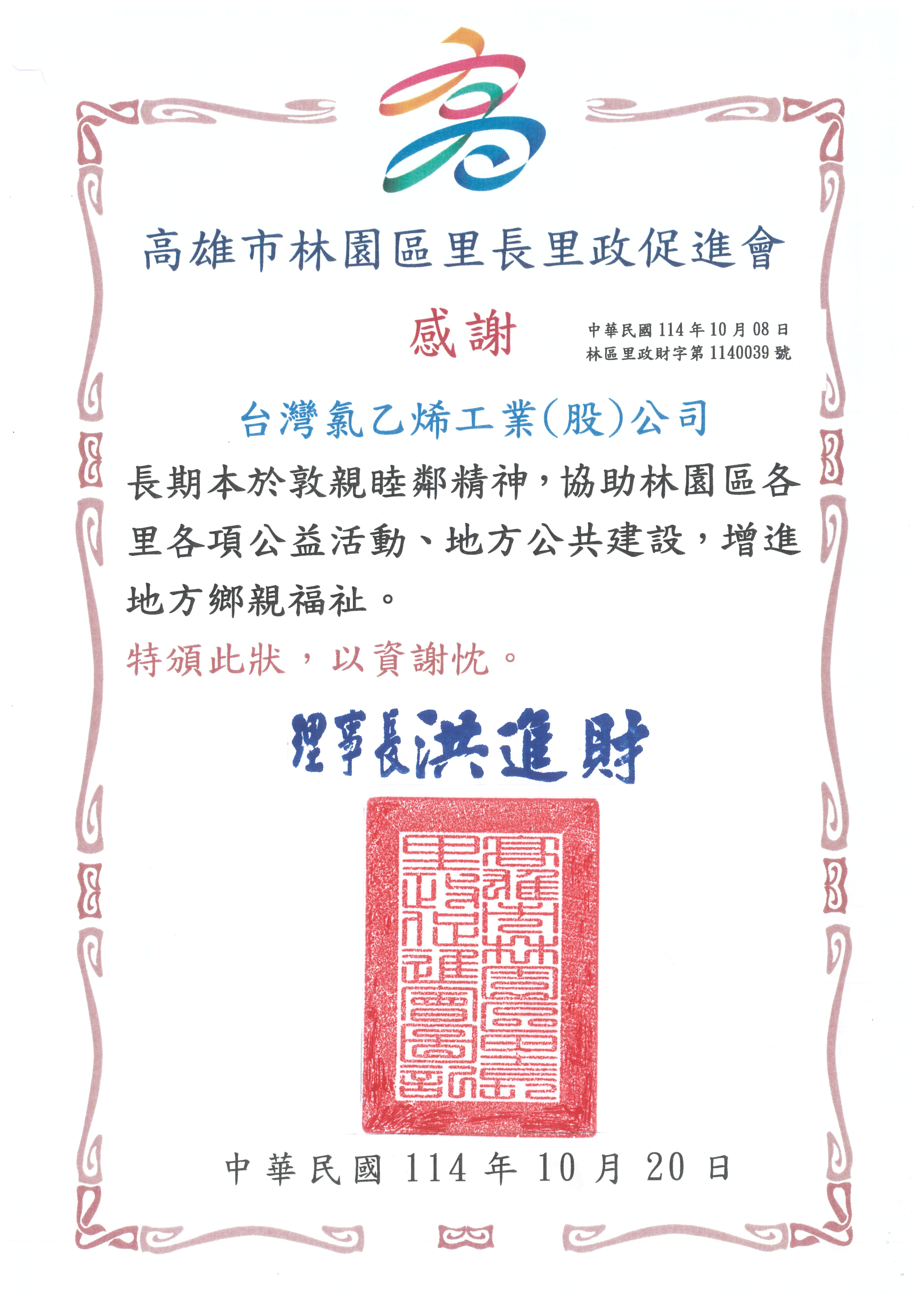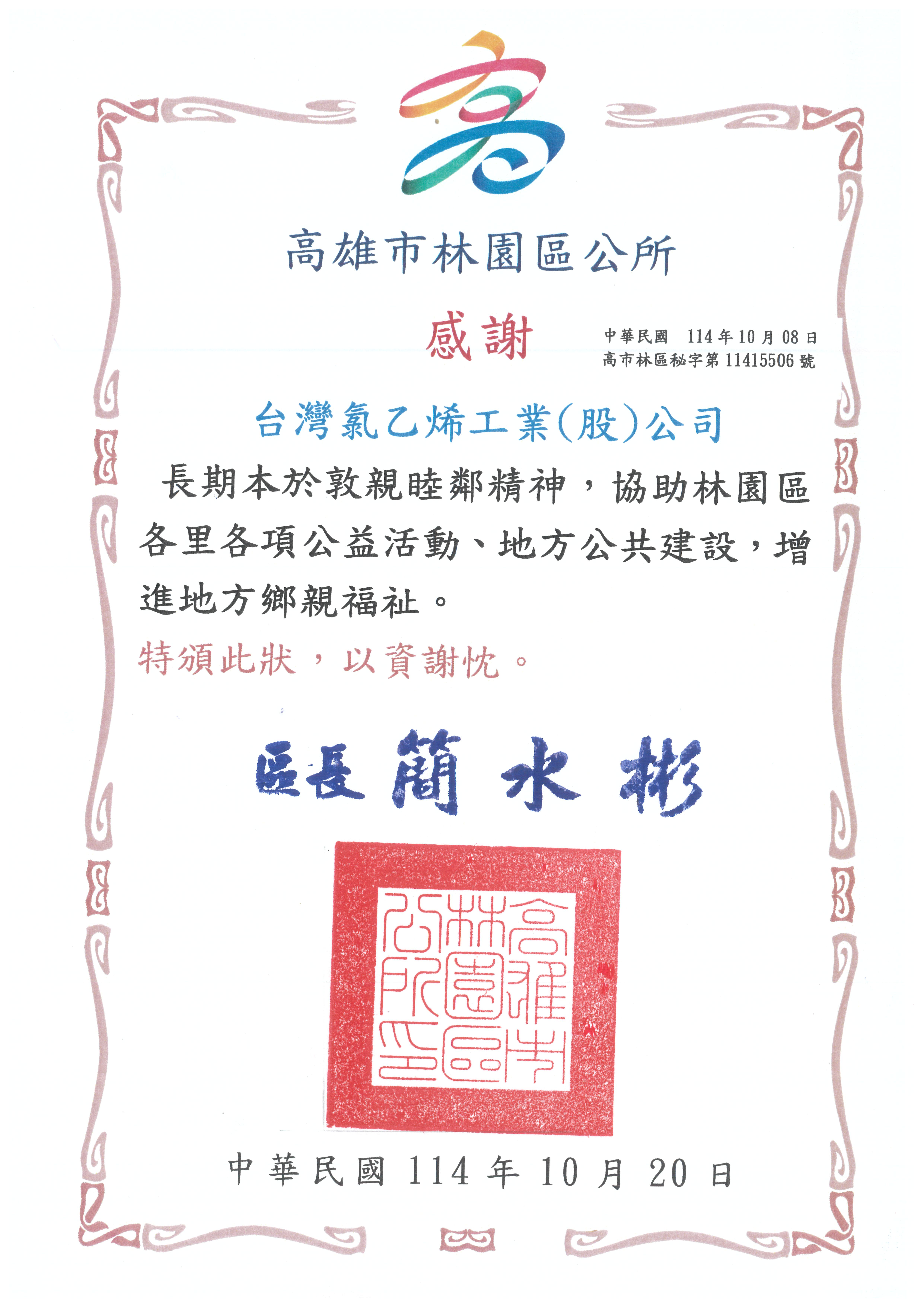 • 2021年  5月 荣获高雄市政府警察局林园分局颁发「