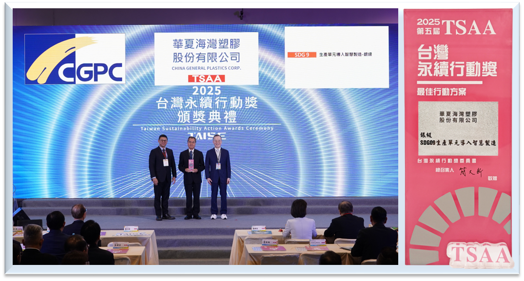 台湾永续能源研究基金会(TAISE)于 2025 年 9 月 11 日举办「2025 亚太暨台湾永续行动奖」,本届共计 503 件方案参赛,较去年成长 12.2%,最终评选出 399 件优良案例。台氯由母公司华夏海湾代表参赛,以 SDG 9《台氯生产单元导入智慧制造》 专案荣获银奖,并于台北世贸一馆举行的颁奖典礼中,由华夏 胡吉宏总经理代表受奖。