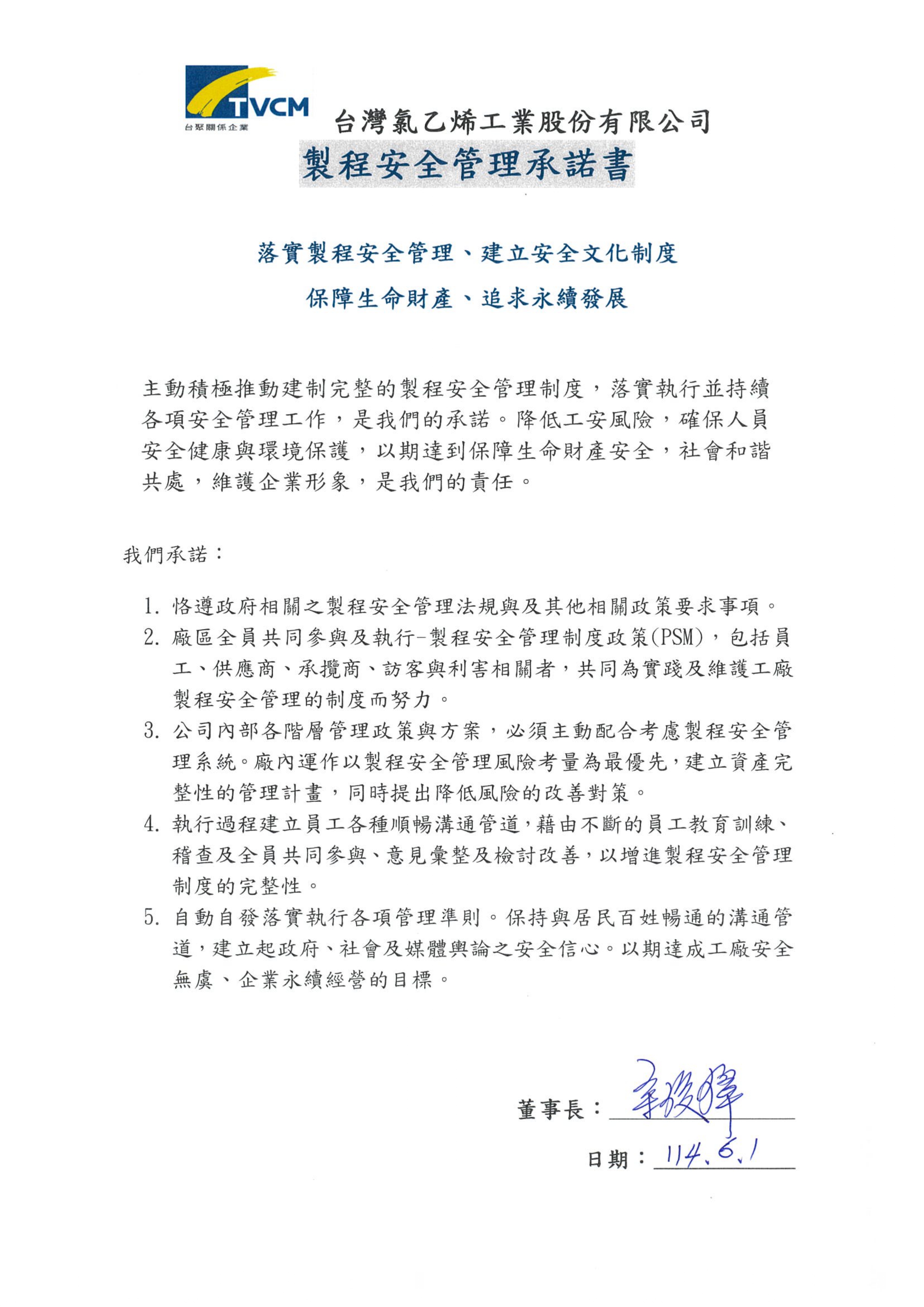 台氯公司本著永續經營與社會責任的精神,致力於持續優化公司體質。自2016年起汰換老舊設備,透過優化設備材質等硬體設計,有效提升設備可靠度。此外,為進一步提升製程安全水平,自2019年起,台氯公司所屬之Vinyl Chain鹼氯事業群,率先在台聚集團內導入PSM,由高階主管承諾推動,率領同仁積極參與執行,並聘請外部顧問及其團隊,以產學合作方式階段性導入,建立程序標準化之工廠文化。